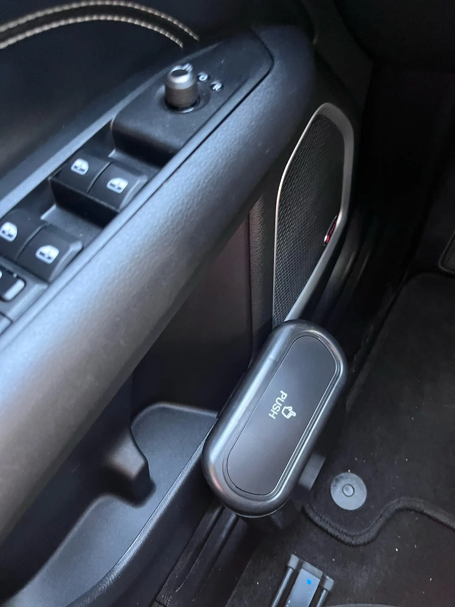 It has a discreet clip on the back that allows you to securely attach it to a car seat pocket or door lining. It is also compact enough to simply rest in a cup holder or side console.